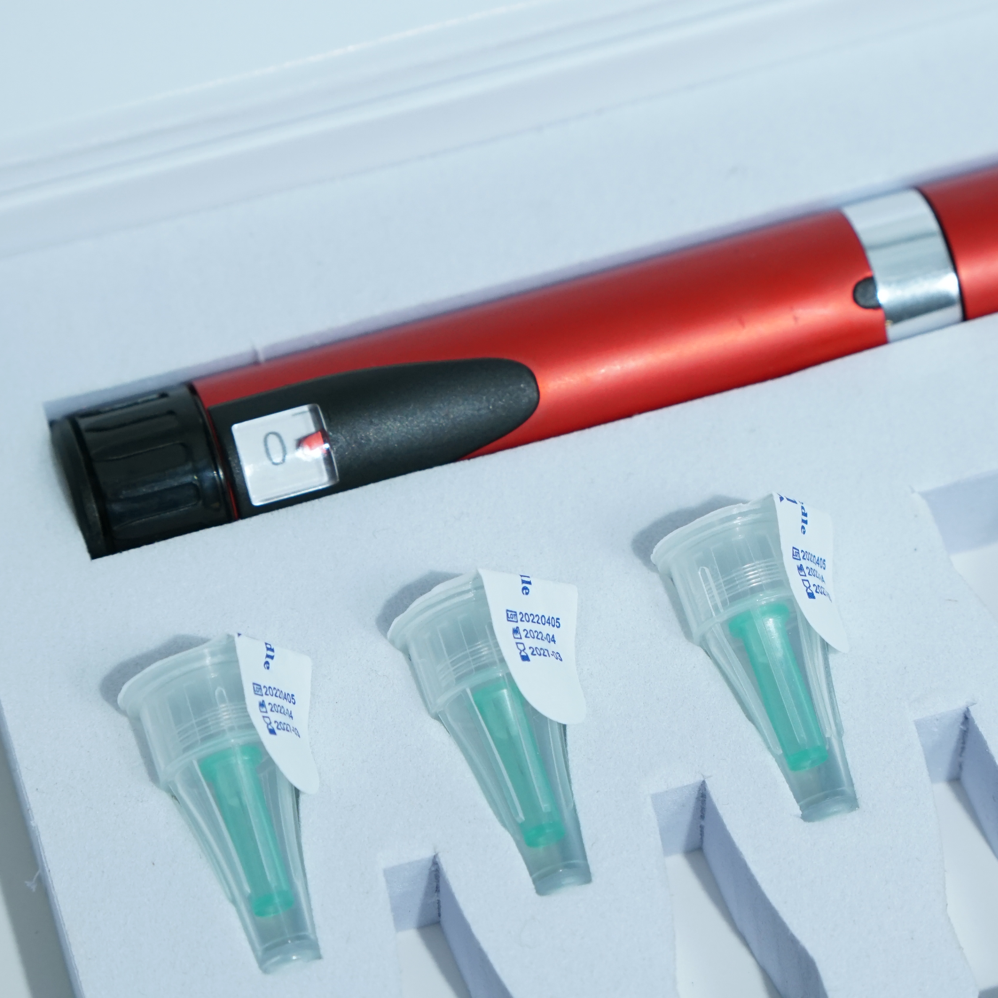 The layout supports an all-in-one injection system, allowing injection pen, cartridges, and needles to be packaged together in a clear, organized, and compliant manner.