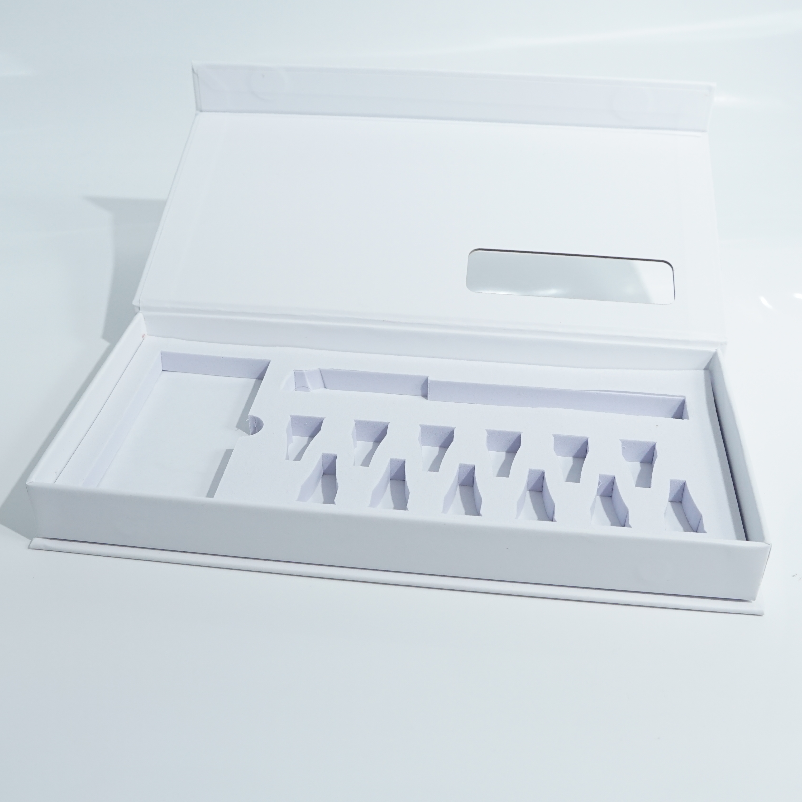 The case adopts a rigid paper box structure with a precision-cut inner tray, ensuring each component is firmly positioned during storage and transportation.
